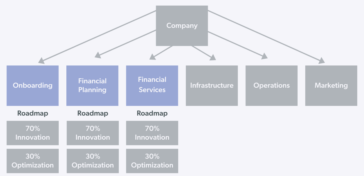 Conversely — and is the more common scenario I’ve seen at early stage startups — is that topline growth has stagnated as a result of having not shipped anything new and innovative in the last 1-2 years. That’s often the case since most businesses do not have a network effect and must therefore grow through new product innovation. The following example comes from my time at Wealthfront. At one point three out of four product teams were setup to focus mostly on new product innovation (Onboarding, Financial Planning, Financial Services) and one team was set up exclusively for optimization (Growth). Within the Onboarding, Financial Planning, and Financial Services roadmaps, the teams then have an explicit balance of how much of their efforts is dedicated to building new innovative features versus optimizing the existing products.