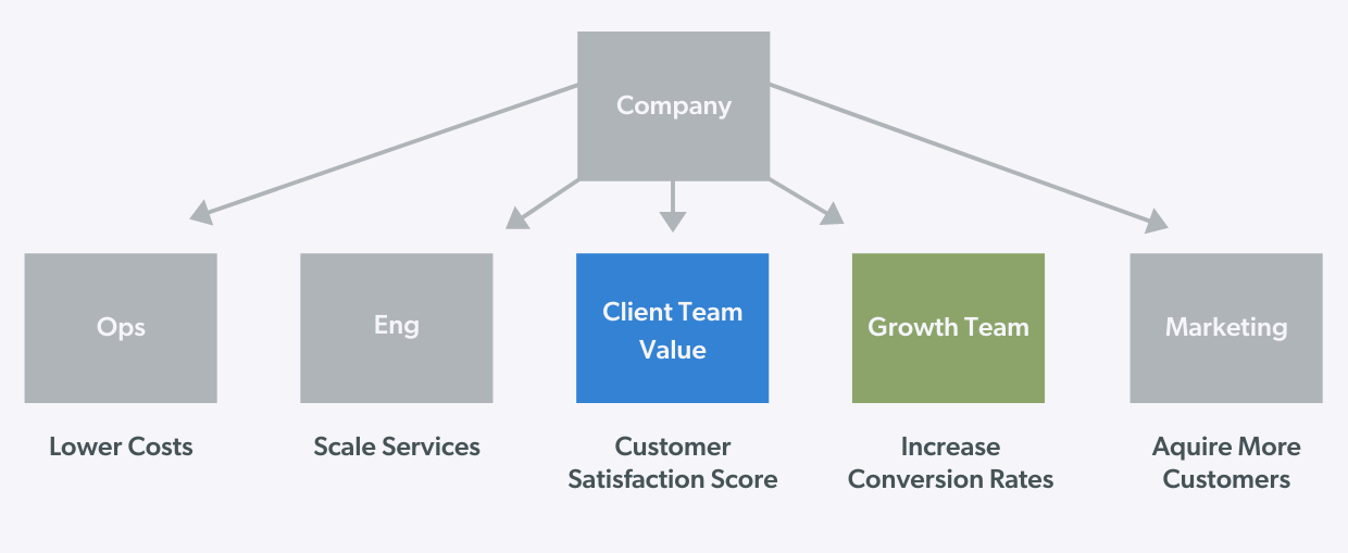 What can be done? The company could have considered an alternative to the org chart that struck a better balance between having some focus on optimizing for business value and some on innovation for customer satisfaction. This may in turn create business value far greater than the value that comes from solely optimizing for business metrics. Below is an example alternative that swaps the LTV Team for a Client Value Team. This new team’s primary metric is customer satisfaction score— e.g. the percent of customers “very satisfied” with their experience.